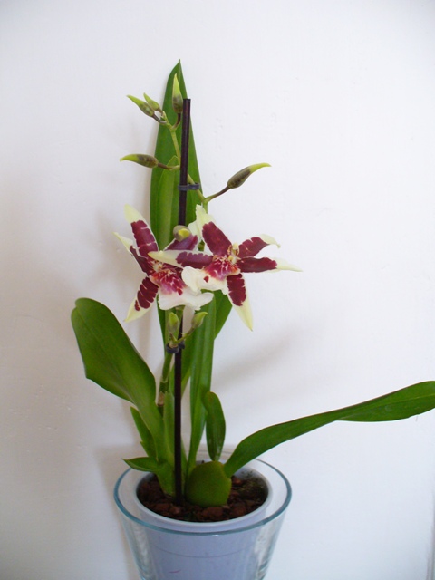 posilam foteckykvetu -neni to bohuzel moje zasluha,ale radost delaji.To prvni je minuly tyden koupena " Cambria " v Plusu-byla to jen poupata,takze to bylo prekvapeni,nicmene vypada jinak nez jsem myslela-mela by mit 10 kvetu a ma novou peknou rostlinu.No a druha je mnou dlouho ocekavana pred 3 tydny koupena V.Sumon Spot x Ascda.Phairot x Ascda. Yip-Gua Chia Long od Lukscheitera.Baervne jsem spokojena-je takova kremovooranzova s vinovymi teckami.Jen ten vyhon vytrcel tak blbe mezi listy,ze jsem do vazy musel dat tycku aby kvety neryly do listu.Zatim ma 3 kvety otevrene a 9 jich snad bude mit urcite.