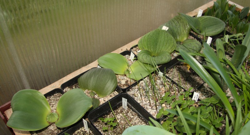 A ještě mé oblíbené jihoafrické cibuloviny. Nejprve pohled na "progres" v koutku masonií a detail Massonia pustulata - mezi listy se už rýsuje květní puk. Na dalších fotkách zástupce krvokvětů, aby se to nepletlo bělokvětý Haemanthus sp. Ratelkloof. Sbírán u stejnojmenného městečka, bude asi patřit k běžnému druhu Haemanthus albiflos, ale liší se od něj sympatickou velikostí; je určitě aspoň pětkrát menší než klasický druh, který se u nás hojně pěstuje pod jménem "sloní ucho" (aspoň u nás ve východních Čechách ;) ).