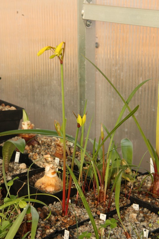 Pak následuje nepříliš fotogenická Lachenalia reflexa, kvetoucí třetím rokem po výsevu, a tvořící se první květenství u Veltheimia bracteata.