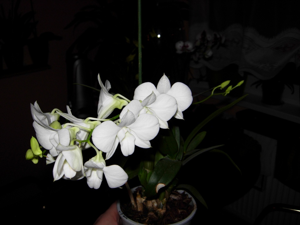 Zdravím a přikládám pár foteček....Vanda mi udělala vážně radost-nevěřila bych, že vykvete v tak žalostných světelných podmínkách-pravda květy jsou menší, ale dělají i tak velkou radost. Dendro mě také překvapilo-hned 3 stvoly a má oblíbená sněhobílá a ten Phal kvete již 3měsíce-sice malej, ale šikovnej