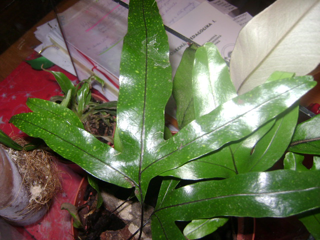 Ještě jsem ti to vyfotila mám tam taky pidi tečky(na jedné)-třeba to je normální.A ta druhá kapradina (Microsorum )to je primadona.Jednou jsem ji moc zalila a měla přímo mokvavý fleky.Vyschla a já ji od té doby skoro nezalévám samo ve svých podmínkách.
