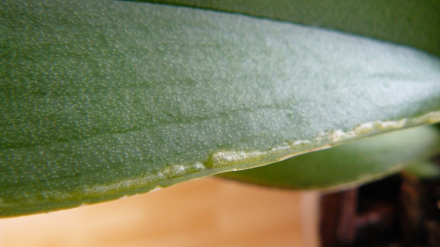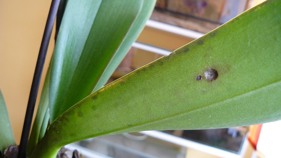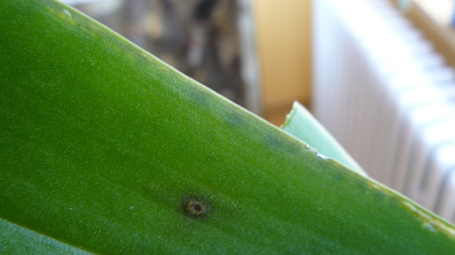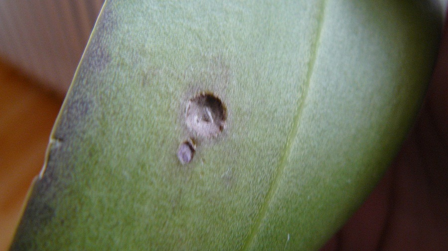 dostala jsem novou orchidej, která měla 2 čenohnědé fleky na listech jeden list jsem již odstřihla,ale druhého je mi líto.Skvrna je jakoby propadlá z dolejší strany listu větší.Okraje některých listů jsou taky nějaké ošklivé,nevím čím to.Zkusila jsem rostlinu postříkat "česnekem" a beze změny.Celkově mi přijde rostlina moc pěkná jen nyní jeden problémový list.Neví někdo o by to mohlo být?Děkuji