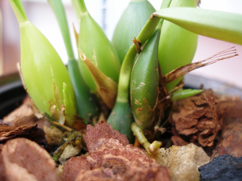 Zatím na ní nejsem žádný odborník, mám jí teprve rok- přesazoval jsem v 5/2011, použil jsem můj standardní "katlejový" substrát ( borová kůra asi 0,5-2cm, dřevěné uhlí a polystyrén, poměr asi 3:1:1, plastový květináč) je na parapetu , kde mi jdou katleje, spíš na té horší straně (je to půloblouk od SV k JZ) -tedy asi na východní straně. zalévám lehce více než katleje, ale mírně vždy proschne. Teploty nevím přesně, ale je to obývák (tím , že je to vystrčený půloblouk, tak kolísání je celkem zaručeno, reguluji vždy přisunutím k okennímu sklu nebo odsunutím),sklo bez stínění. Voda z RO 10-20 mikroS/cm, hnojení wuxal- vodivost tak 150-250 mikroS/cm.