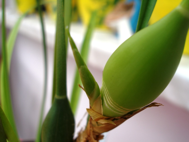 Uvidíme, jak půjde dál, kořenů moc nemá... Původně měla 3 pahlízy, dvě z nich udělaly po jednom "záprcku"(ten vykvetl jedním květem) a pak regulérní novou, která má 4 a 3 květy a pokračuje dalším výhonem.