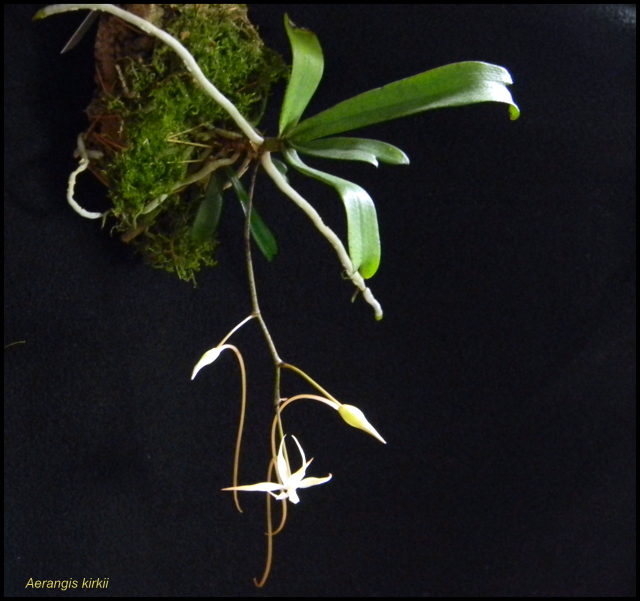 Aerangis kirkii, zástupce afrického kontinentu. Celoročně teplé pěstování, rostlina mám vyvázanou na korku s mechovou podložkou. Umístěná celoročně ve vitríně.
