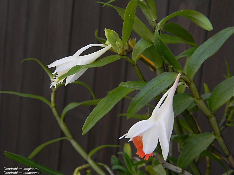 s Romčou jsme řešili rozdíl mezi Dendrobium longicornu a Dendrobium chapaense. Dávám pár fotek i pro ostatní, které to zajímá.moje longicornu má o něco užší lístky, dlouhé a tvarem jsou naprosto stejné. Bez květů se tyto dvě rostliny asi těžko od sebe odliší. Květ má stejnou stavbu, chapaense má květ o něco větší, ale nevím, jestli to není tím, že to je starší rostlina. Jinak u květů je rozdíl patrný na první pohled - longicornu světle žluté žilkování pysku a střapečky na pysku; chapaense barva ostře oranžová a pysk je jen zvlněný.