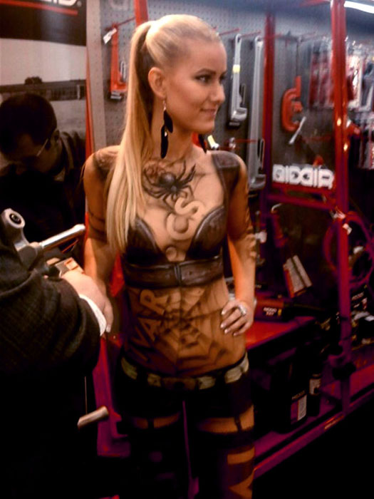 Malé odlehčení. Nejen na plátno se dá malovat a je to zajímavé. Takový malý návod pro tropické dny léta. Bohužel foceno jen telefonem. Bylo to zajímavé zpestření v jinak úmorných dnech vystavování na Aquathermu. A holky byly "oblečené" každý den jinak.