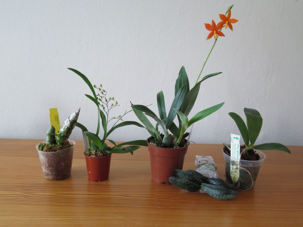 Zleva doprava: catasetum pileatum, Oncidium Tiny Twinkle, encyclia vitellina, paphiopedilum niveum, phal. tetraspis.