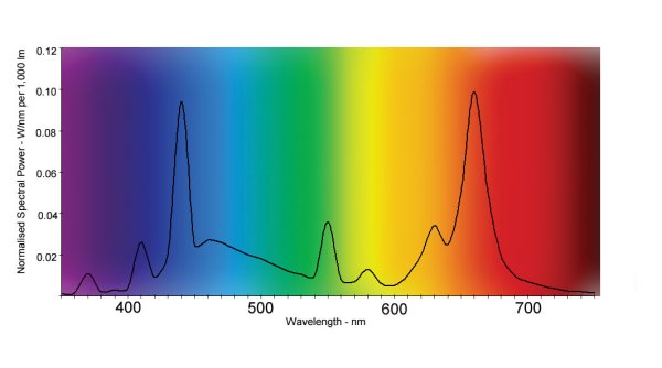 Rostliny využívají pro růst přibližně celé spektrum viditelného záření. Nejlépe však dokážou využít modré světlo (okolo 440 nm) pro růst a červené světlo (okolo 680 nm) pro tvorbu květů (viz obrázek Par_action_spectrum). Nevhodnější jsou tudíž světelné zdroje s největším světelným tokem (měřeno v lumenech) vyzářenou v uvedeném spektru. Z ekonomického hlediska je pak důležitá účinnost přeměny elektrické energie na světlo z parametrů jednoduše vypočitatelná jako poměr svítivosti a el. příkonu. Z toho co je na trhu k dispozici se mi jako nejvhodnější jeví fialové lineární zářivky britské firmy NLITE nabízené např. na http://www.klecka.cz (ovšem pouze za předpokladu, že informace uvedené na stránkách http://www.nlites.co.uk/linear.htm jsou správné, tzn, že uvedená např. 14W zářivka má skutečně inzerovanou svítivost 1250 lumen - trochu o tom totiž pochybuji). Pro nejméně náročné rostliny by mohly na osvit 1 m2 vitríny stačit už asi 3 ks, pro náročnější (např. cattleye) až 8 ks těchto zářivek. Asi nejsnáze sehnatelné a cenově o něco dostupnější jsou lineární zářivky Osram lumilux T8 SKYWHITE s barvou světla 8000K. Zářivky prodávané v akvaristikách nejsou vhodné z důvodu nízké účinnosti přeměny el. energie a světlo a nízké svítivosti.