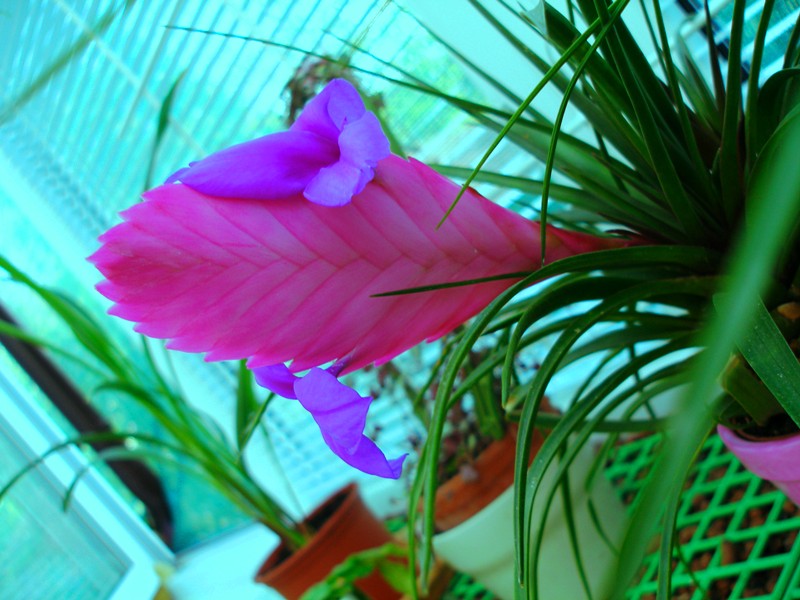 Rozkvetla Tillandsia cyanea, škoda, že můj foťák neumí vyfotit tu krásnou, hořcově modrou barvu