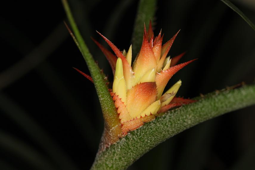 Dobrý večer. Tak, po roce od osázení, objevují se na větvi první květy. Zatím jen bromelie, ale i tak to potěší. Jupíí.