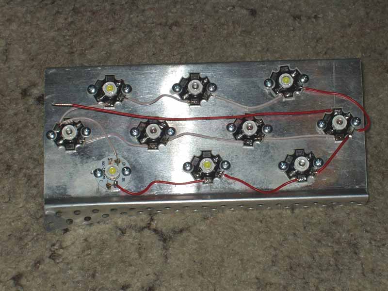 Dobré výsledky dosahují jednotlivé ledky 3W. Ve skutečnosti je lze provozovat max. jako 2W, asi nejlepší účinnost mají kolem 1W. Používám bílé, červené i modré (foto).