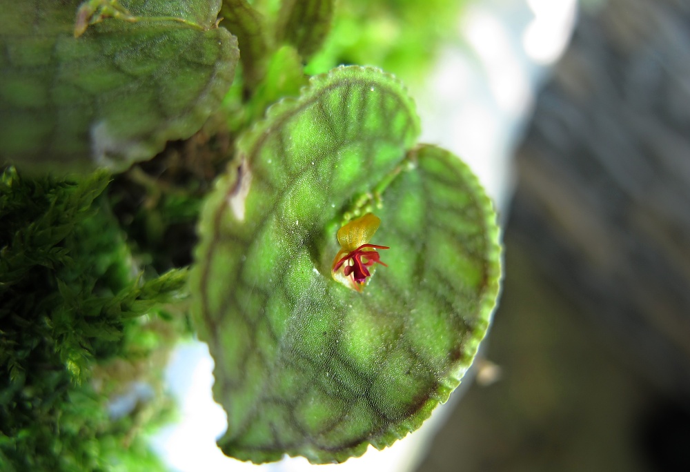 Další který kvete je Lepanthes tentaculata také se zvlněným okrajem listu .Poupě tam už bylo jen květ je zatím takový pomuchlaný snad bude líp. Tento jsem si koupila hlavně pro list taky se zajímavou kresbou jak Lepanthes calodictyon .I když tentaculata je zatím světlejší a kresba není tak výrazná.