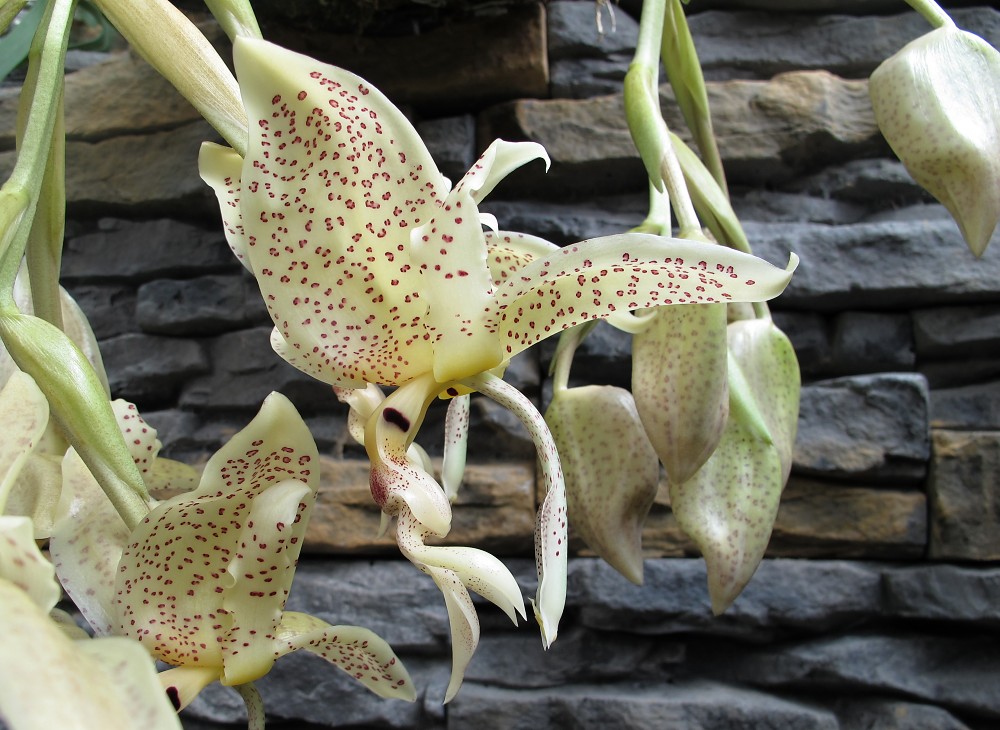Tak dávám fotky. S určením mě pomohli v Mendelově univerzitě v Brně kam jsem napsala prosbu. Stanhopea byla koupená(září 2009) pod názvem Stanhopea embreei určena jako Stanhopea costaricensis. Doma říkají ,že voní po hašlerkách já na rozlišení vůní moc nejsem ale voní až do domu to jo.