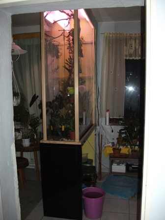 problém vysokých vitrin je tma dole. Já vždycky doporučuji (i když se zdá, že to svítí do očí) svislé zářivky do každého rohu vitriny. Je tam i pro kytky dole dostatek světla. Dají se koupit vodotěsné a nesmí sahat až dolů ale nejlépe tak 5-10 cm od spodu. Rohy se dají mírně rozšířit nalepením lesklé hliníkové folie z venku nebo zevnitř aby to nesvítilo do očí. Ty protější jsou