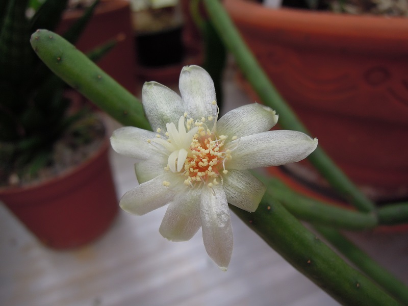 Rhipsalis neves armondii, květ jemně voní, za povšimnutí stojí vpravo nahoře silně ostnité články.