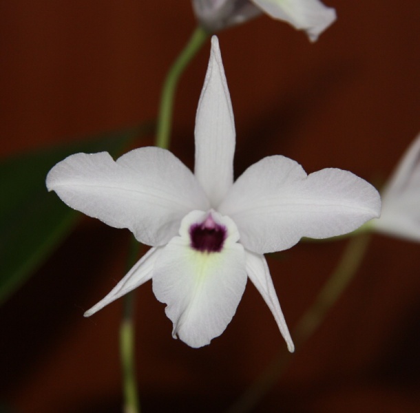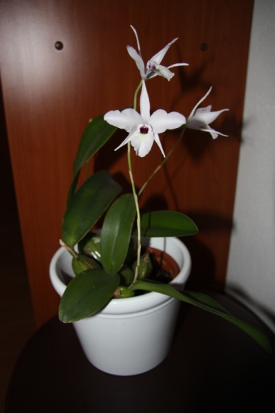 Mám tuhle kytku v opatrování přes rok. Je v nějaké směsi v hrnku z pálené hlíny s dodatečně na boku vyřezanými otvory. Koncem zimy se do ní dala nějaká hniloba, pahlíza vždycky zespodu zhnědla a zbřečkovatěla, vršek zůstal v pořádku včetně listu. Postupně jsem takhle přišel o polovinu rostliny. V květnu se to zastavilo, v půlce července se objevily čtyři nové pahlízy, jedna momentálně nasazuje květní stvol. Kvetla mi už loni v prosinci, květy jsou čistě bílé s temnou skvrnou uvnitř pysku.