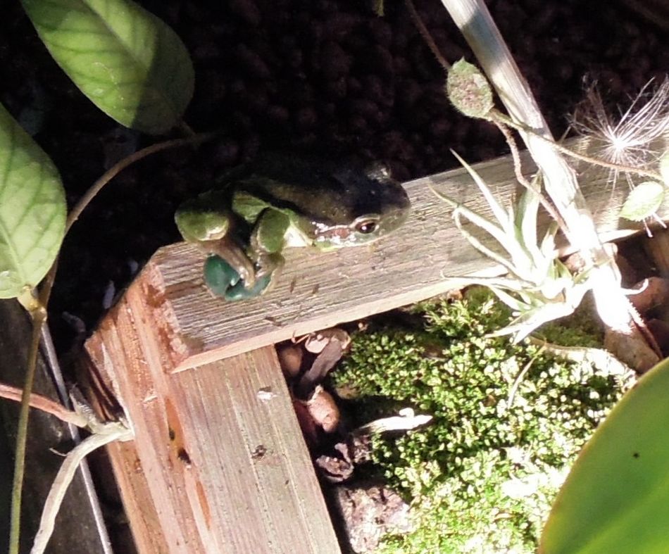 V prvním patře mám ve skleníku akvárium na kovovém podstavci. A v něm, hle, kde se vzala, tu se vzala, žabka, carevna to asi nebude. Jak se dostala nahoru a do akvárka nevím, nevím o ničem, co bych zvenčí strkala do něj.