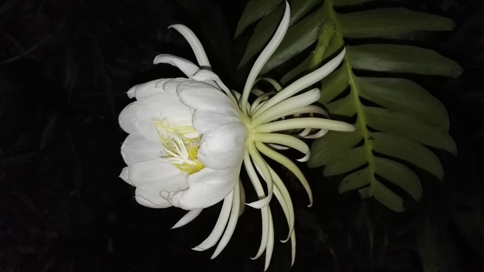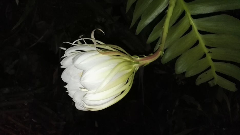 Momentálně kvete epifytní kaktus Epiphyllum. Obrázky jsou dělané v noci, kvete jeden den v roce. Je hodně bujný , výhony mají hodně přes metr , květy přes 20 cm v průměru. Voní jemně ovocně, asi tak láká noční hmyz a nebo netopýry.