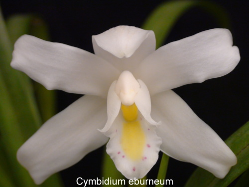 Cymbidium eburneum.První květ na tříleté rostlině od Orchids and More.Zajímavé,že se květní výhony objevily i na dvouletém výhonu,nedotáhly to do konce,zaschly.Označeno žlutými šipkami.Na výhonu z r.2014,označeno červenými šipkami jsou ještě dva květní výhony které to snad(!) dotáhnou úspěšně do konce.Květ jemně voní.Květ je sněhobílý.