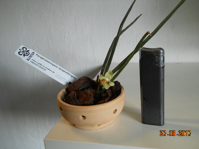 Vykvetl mi Paraphalaenopsis serpentilingua. Nejmenší z celého rodu, ale i tak mne kvetení překvapilo. Kytička je malinká a kvítek tomu odpovídá. Zapalovač je tam pro získání měřítka