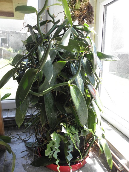 Vypadá to nadějně ale pokud člověk nikdy Vanilku neviděl kvést nelze to říci jednoznačně. Mám ji cca 3 nebo 4 roky ve skleníku a točím ji neustále okolo kmene, který je přes dva metry vysoký. Vyšplhá nahoru tak ji otočím dolů a stále se to opakuje. Je vsazená přímo v zemi v klasické půdě. Roste jako blázen, listy stále větší jak kořeny prorůstají zeminou blíže k jezírku. Už bude dlouhá možná 10 metrů ale rozmotávat ji nebudu. Tohle omotávání nahoru a dolů jsem viděl na fotech z plantáží, tak to také tak dělám a těším se, že také uvidím květ. Údajně kvete cca 3-4 rokem ale když má prý délku cca 6m.