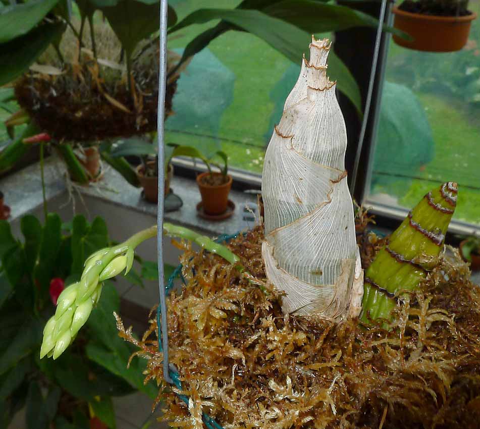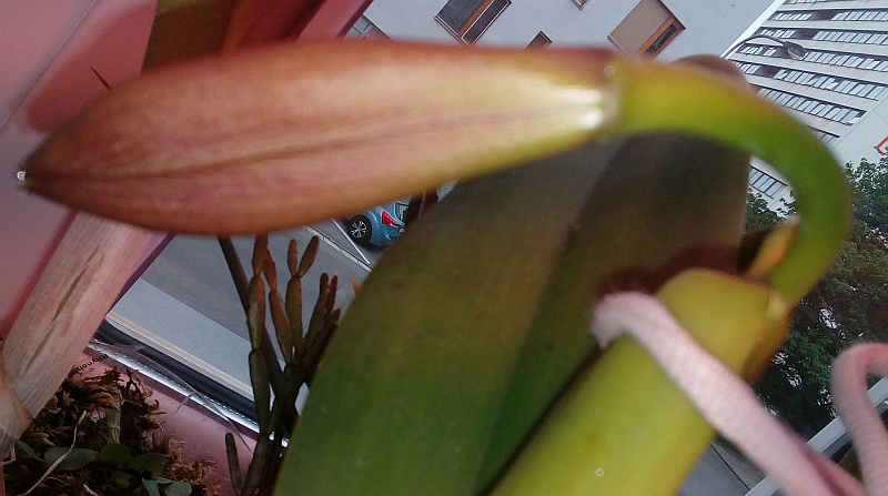 Tak u rostliny Catasetum schunkei, které jsem si přivezl z Drážďan a pak musel odstranit hnijící pahlízu vývoj květenství pokračuje a pahlíza ani moc nezcvrká. Možná si pustila nějaké kořeny v mechu.