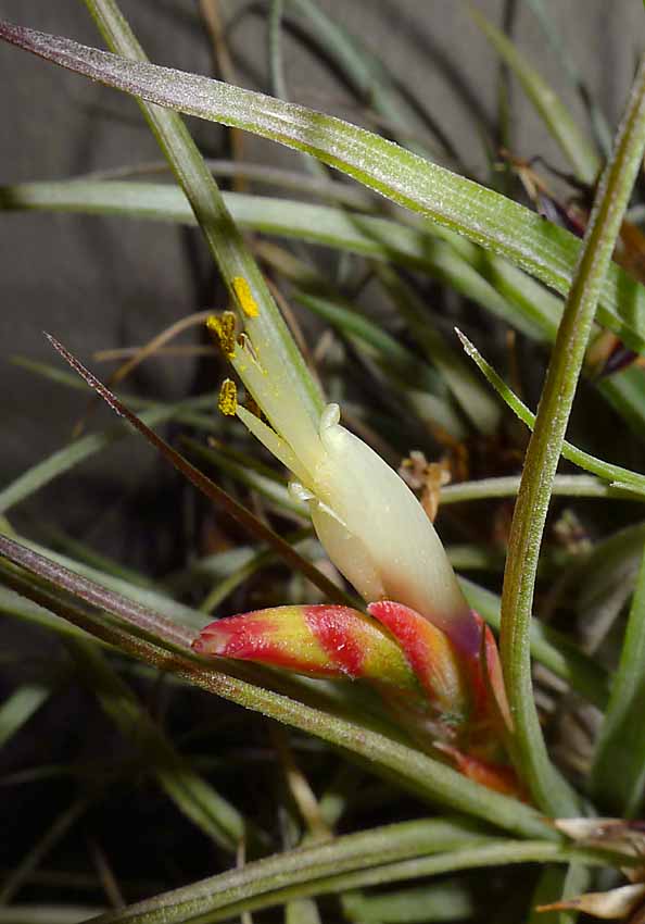 Dnes mi rozkvetla tato stříbřitá. Nejprve jsem si myslel, že mi na stvol přistál nějakej kus toaleťáku či nějakého jiného bordelu. Až pak jsem si všiml, že je to takový nepravidelný bílý květ :) Mám u ní krkolomný název T. diaguitensis