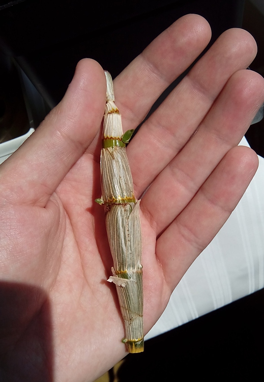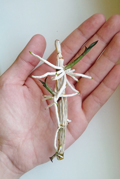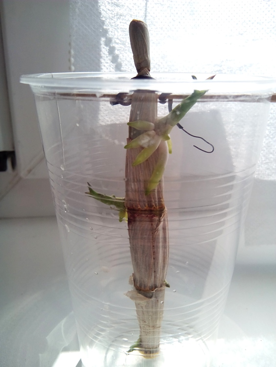 Najprv som samozrejme dal pahľúzu do vlhka, no za pár dni bola plesnivá. Preto som ju vybral a nechal tak. Po nejakom čase na suchu (za občasného namočenia odrezanou časťou - viď foto) sa začali prebúdzať spiace očká a rásť mladé výhony.