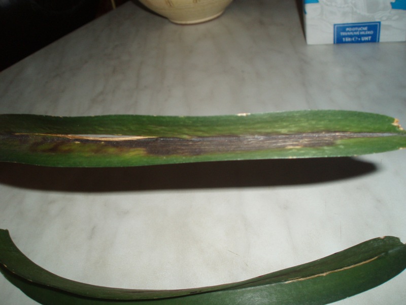 ahoj, dnes jsem s hruzou zjistil neco na vande.nevim co to je a cim se to stalo,nikdy se mi to nestalo a tak si nevim rady.na 2 spodnich listech se udelali cerne fleky,radeji jsem to ustrihnul.vsimnul jsem si ze i jeden horni list ma nejake flicky,jsou malinko zlute.nic cerneho na nem jeste neni ale nevidim to ruzove.neco se s vandou deje a ja nevim co.poradte prosim.fotky prikladam...