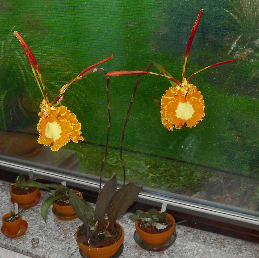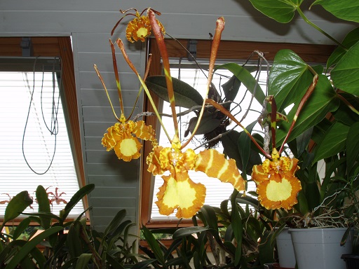 Tak mi akorát dorostl druhý květní stvol na Psychopsis papilio. Směřoval jsem ho drátkem podél prvního, aby oba šly stejným směrem. Děsila mě představa, že každý stvol půjde na jinou stranu a rostlina bude hodně rozlehlá. Asi i v přírodě kde nikdo kytku neotáčí a nepřemisťuje rostou stejným směrem- tedy za světlem.