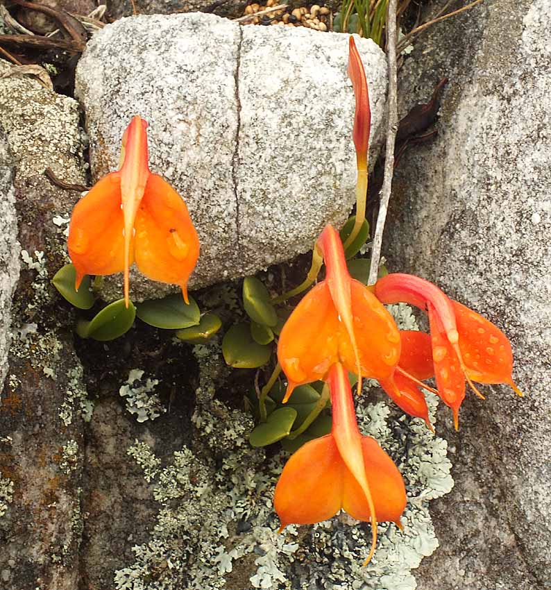 Připadá mi, že Váš tip je asi nejblíže. Má silně ztloustlý list a roste běžně terestricky. Akorát jsem našel na Google pouze purpurově nebo červeně kvetoucí jedince. Tato oranžová forma je možná o to vzácnější. Barva květu ale asi není rozhodující. Ještě seženu nějaké fotky a něco o lokalitě. Říkali mi, že mají i detaily.