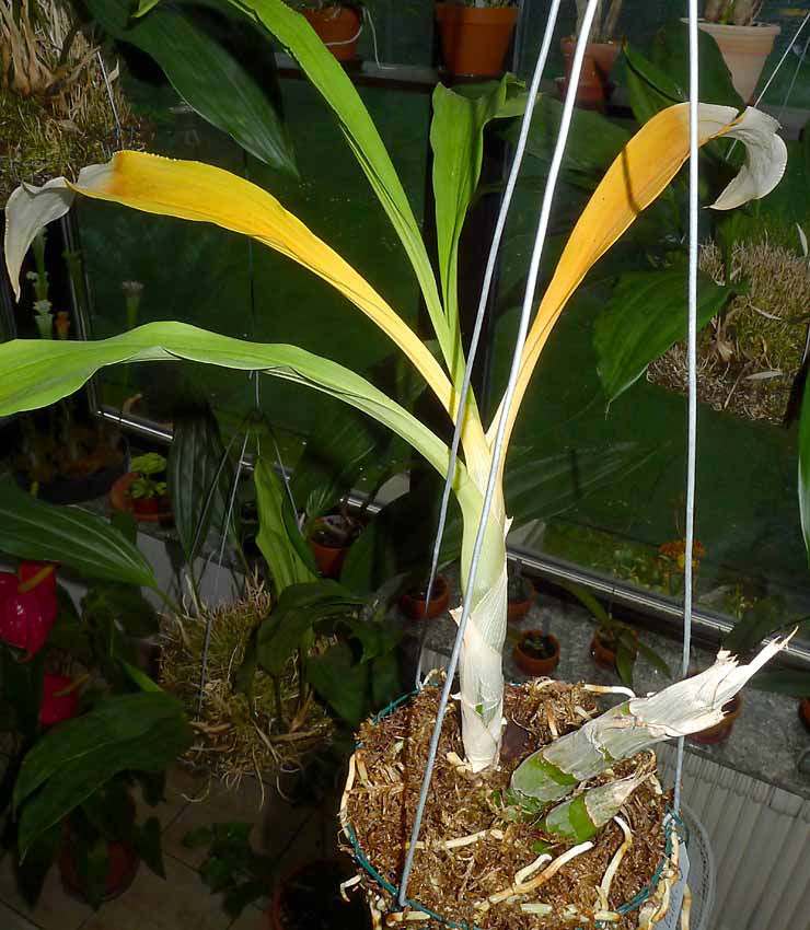 Ta Cataseta si někdy dělají co chtějí. C. schmidtianum je nyní napité a raší a přitom mu z prostřed začaly opadávat listy. Listy ale žloutly na etapy. To co vypadá jako spálené zežloutlo v zimě a pak po zálivce se žloutnutí zastavilo v půli asi na dva měsíce. Nyní ty dva listy zežloutly celé, ale ostatní jsou zatím zelené.