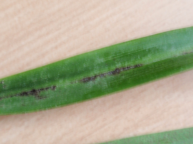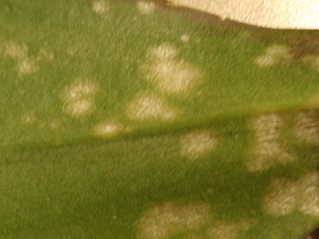 Posílám problém, který se vyskytl na listech. 1. phalaenopsis, 2. cymbídium. Oboje na spodní straně, jen u cymba jeden obr. vrchní.