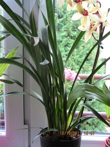Před dvěma lety koupeno jako Cymbidium hookerianum a jestli jsem dobře dohledala, je to nakonec asi Cymbidium erythraeum. Určila jsem to dobře?Začíná vonět, ale mám ho v práci, takže asi v jinou dobu než jsem tam já, řekla bych, že asi jako voskovka(kytka). Jen podmínky ve kterých byla v létě jsou odlišné od požadavků na tuto rostlinu. Celé léto od půlky dubna do půlky září byla venku na slunci a u zdi takže výheň, zalévaná jako ostatní květiny venku a stejně hnojena + déšť, žádné specialitky, hezky Kristalon a žížalí voda na střídačku. Je v čisté kůře.