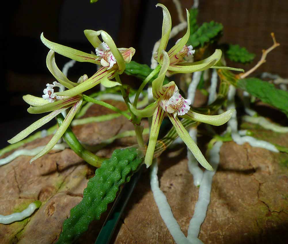 Mně rozkvetla letos podruhé Doctrillia cucumerina. Obě květenství jsou na stejném rhizomu který přerostl do stínu na severní stranu kůry. Jestli se z toho dá na něco usuzovat nevím. Každopádně se to hodně špatně fotí.