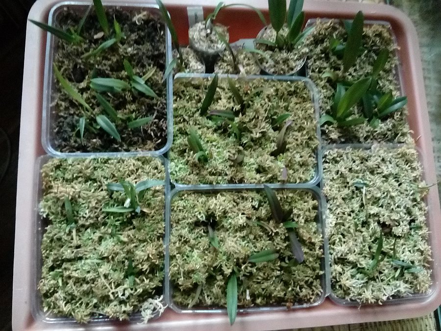 Prodej asi od konce února (pište SZ):Nahoře: Euchile karwinski (= Encyclia citrina), Laelia harpophylla, C. lawrenceana x Schomburgkia superbiens, C. lawrenceana, C. granulosa x C. dowiana v. aurea, 3. L. autumnalis již samy. Dole: C. rex (var. Splashed in petals&sepals x var. Splash), Jumellea arborescens a Bulbophyllum maxillare (poslední, nedám). Citrina (2 misky po stranách dole) nezaručena, dost chcípou. Jediná rostlina nahoře vedle 3 L. autumnalis vpravo má být Schomburgkia albopurpurea, ale podle tvaru pahlízy to asi není, zas jsem nejspíš naletěl. Ještě mám prcka od Elsner, ta snad bude pravá.