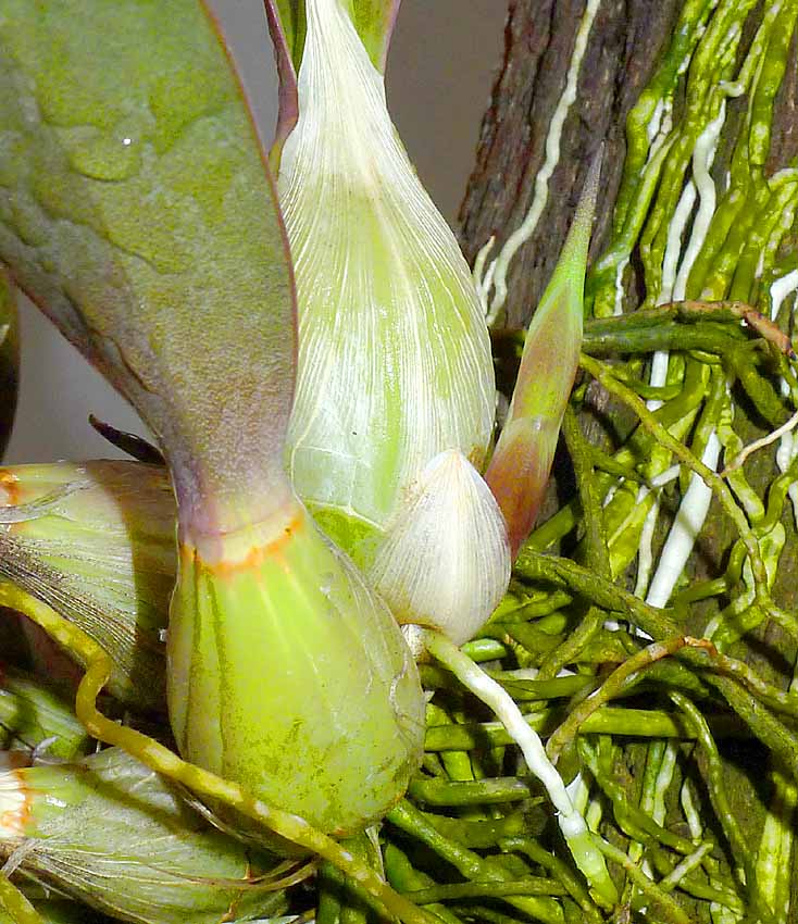 Jsem zvědavý jestli se sejdou všechny květy. Loni květy vydržely cca 14 dní, tak snad ano. Letos jsou stvoly i poupata robusnější než loni. Největší poupě má již 7cm délky. Myslím že tomuto druhu pomohlo pěstování venku až do poloviny října a hlavně kropení i při teplotách okolo 10°C kdy pahlízy rostly před očima. Zřejmě kombinace deště a chladna pro ni není cizí ani v přírodě ve výškách přes 2000m. Musí být ale venku. Letos do ZZ nepůjdou vůbec. Po odkvětu je dám ven a před příchodem mrazů zase do Kakt. skleníku a vodou venku šetřit vůbec nebudu :) . Podmínkami je to asi taková Coelogyne cristata ale musí se pěstovat na kůře, nikoli v nádobě.