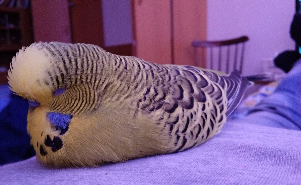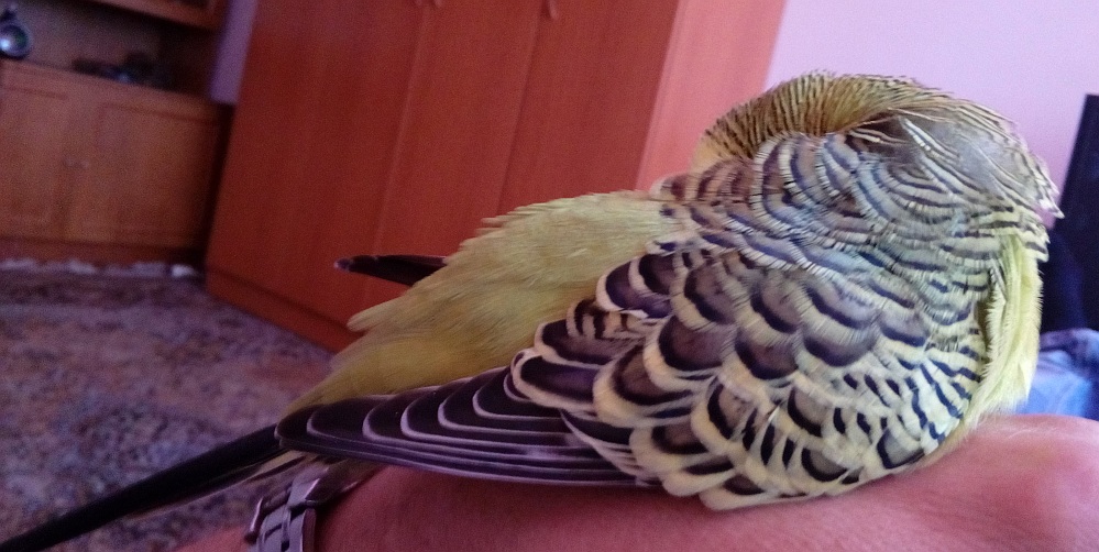 Spí tak na hnízdě, nebo když se cítí v naprostém bezpečí (u svého ochránce například). Jednou mě usnul v pozici mrtvolky, hlavička se zavřenýma očima mu visela dolů. Když jsem se polekal a ho vzal do ruky, myslel si asi že ho chce něco sežrat, kousl mě do krve a s rozzlobeným křikem odletěl.Gabin píše:V takové pozici jsem ještě andulku neviděl