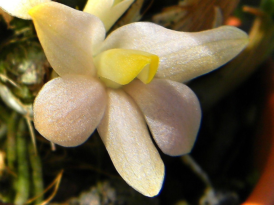 po roce rozkvetlo toto malé dendrobium, krásná krémová varieta. Skutečně se předvedlo, má dvanáct květů.