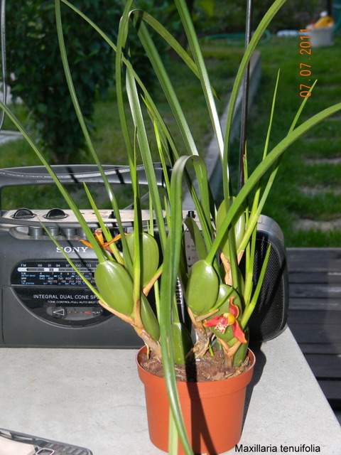 První je Maxillaria tenuibulba, původně před 3 lety pořizovaná jako Maxillaria violaceo-punctata, až časem jsem zjistila, že je to něco jiného, ale nelituju. Je to úžasná drobná kytička, která nádherně přirůstá, nevadí jí suchý vzduch, ani horko a už 2 roky nepřetržitě kvete.