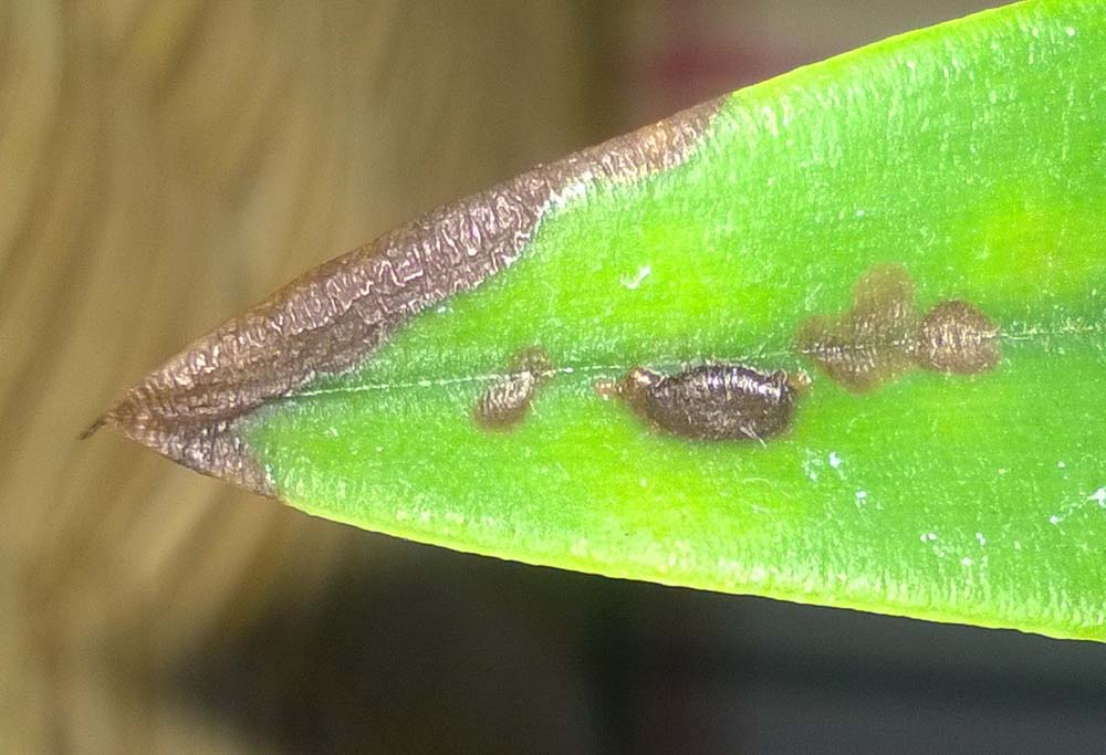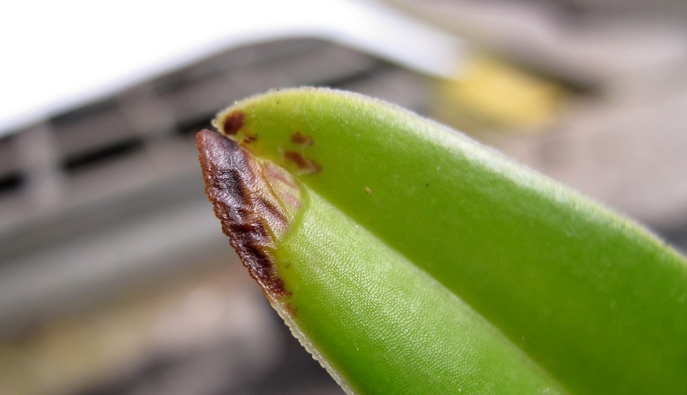 U některých vícekvětých papučí mě to dělá taky. Může to být nadměrným hnojením obecně, taky nedostatkem draslíku nebo vápníku. Laelia gouldiana mi to dělala, ale když ji celou zimu vůbec nezalévám /a to má 20st./ tak to nedělá. Obecně záleží na rostlině, není-li to časté je nejlepší se rostliny zbavit- často jedna rostlina téhož druhu má odumřelé špičky listů a jiná ne- je v tom asi taky genetika.