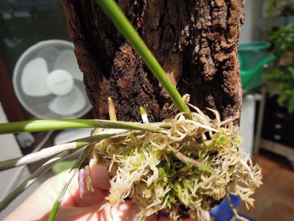 Ty uvnitř nemáš žádný jakoby vodič? Když by rostlo nahoru, mohla bych omotat ten závěsný drát, nebo dát delší a omotat. Nebo dolů přimontovat další kus kůry, když by lezlo dolů. To se mi na orchidejích líbí, že vyžadujou trénování mozku, inovace. Někdy ale mám hluché dny a sotva porosím. Zvlášť nyní, co je ještě práce na zahradě.