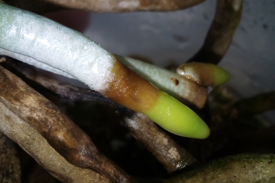 "Minule" rástli 2 korene - keď sa to objavilo na prvom, odrezal som ho. Na druhom som nechal tak, aby som sledoval priebeh situácie s tým, že ak sa to bude veľmi šíriť, hneď ho odrežem. Koreň ale zaschol (teda špička). Teraz po nejakom čase zase rastú 2 korene - jeden už "hnije", druhý zatiaľ v pohode.