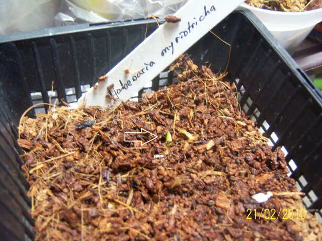 Hlízku co raší jsem zasadil do směsi agroperlitu, odkyselené a lehce přihnojené světlé rašeliny a drceného, dřevokaznými houbami prorostlého zetlelého dřeva cca v poměrech 45:45:10.