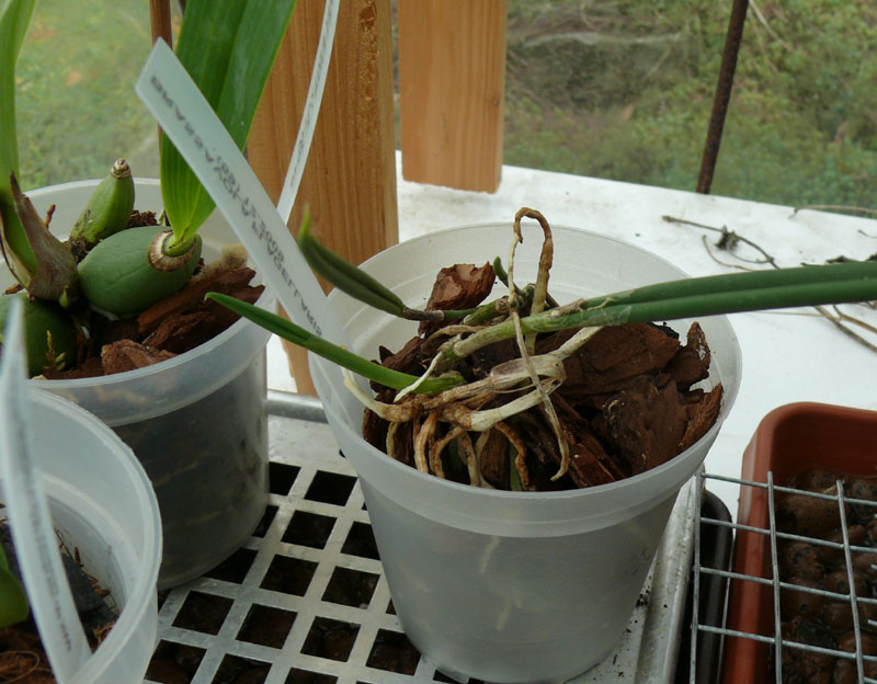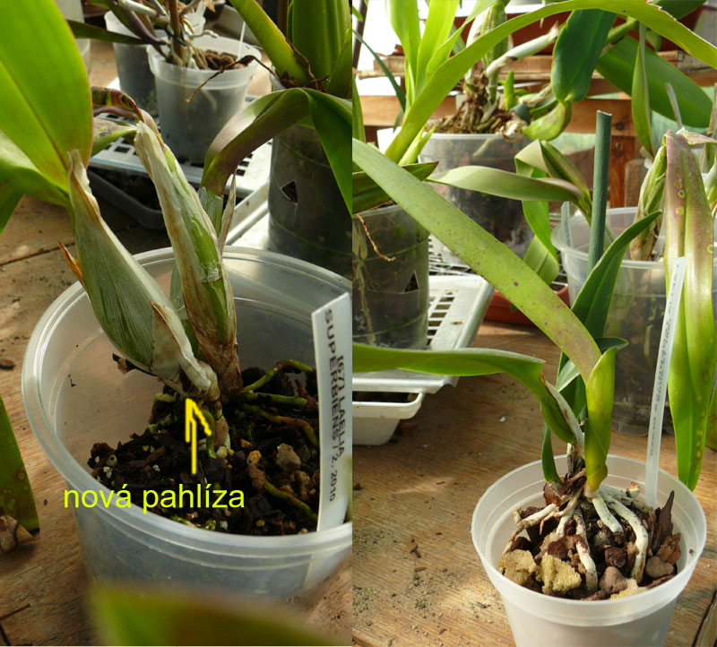 Ano, dám sem fotky, zde je dnešní stav čtyř rostlin, které jsou nyní v růstu. Encyclia vitelina - zárodek nové pahlízy, brassav. flagel. nová pahlíza asi centimetr velká+růst kořenů; laelia superbiens - růst kořenů z nové pahlízy, laelia tenebrosa - téměř hotový list - zatím bez tloustnoucí pahlízy. také v růstu - tvoří se asi poslední dva měsíce.