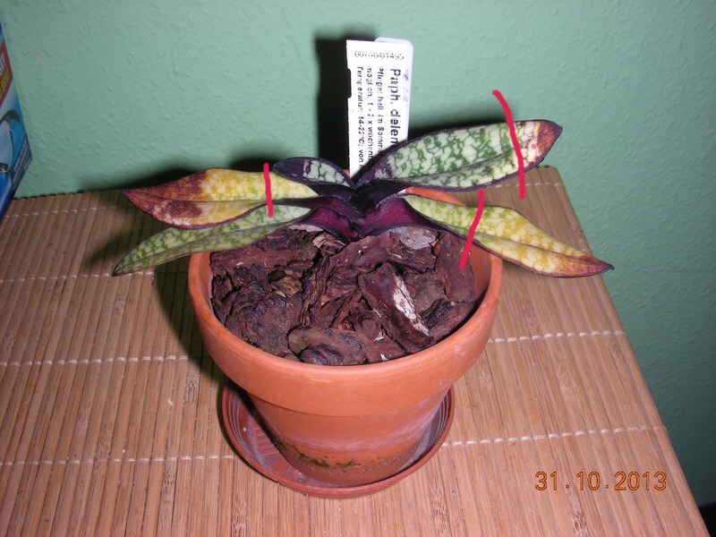 Tak tady je ten můj marod - to žloutnutí listů je záležitost cca 14 dní, jde to neuvěřitelně rychle. Všechny žloutnoucí listy jsou ty původní, se kterými před rokem přišlo, přitom ten jeden úplně nejspodnější je zatím vpořádku (a i ten co mu začal narůstat). Květináček 8cm. Myslím si, že jsem ho dodělala tím, že bylo mokré a hned vedle celodenně otevřené ventilačky, přičemž jsem nevzala v úvahu, že sice přes den je to fajn, ale v noci teploty už hodně klesaly. Nevím, uvítám každou radu a hlavně...vysypat a zkontrolovat kořeny nebo ho nechat zatím být. Samozřejmě jsou už všechna přestěhovaná. Jo a ještě k tomu co psala Haki "nemá rádo vodu u báze" - to je možný, protože právě po nárůstu nového listu jsem přestala být u něj opatrná s tím, že už je vpoho a probral se. Do té doby jsem zalévala jen po okrajích květináčku. Na druhou stranu, s ostatníma Paph. delenatii se takhle nemažu, měli všichni stejný podmínky a ostatním rostou nové růžice. Musím ale dodat - jestli je to teplotama - ostatní delenatii jsou ve větších květináčích a tedy asi o 2 cm výš než byl tenhle punťa.