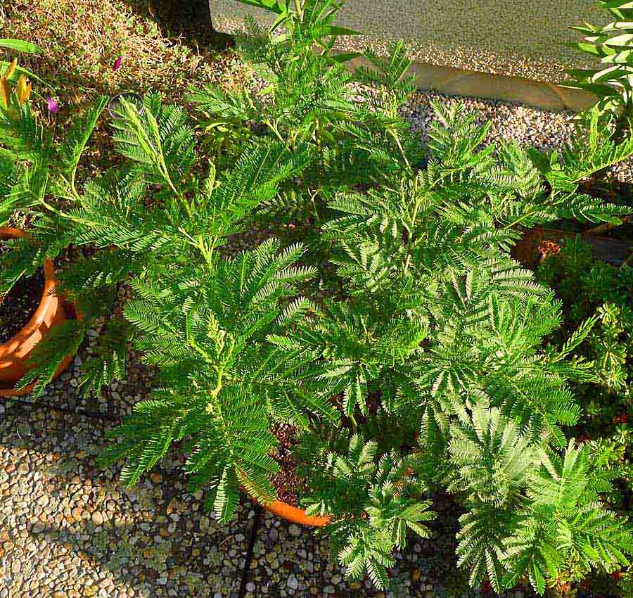 Tyhle rostliny mají zajímavé květy i efektní listy. Mám také malou rostlinu Acacia caulois dealbata. Mám ji ale v květináči a když opadne list tak je z toho neskutečnej bordel! Venku to asi tak nevadí. Právě mi nasazuje na květ.