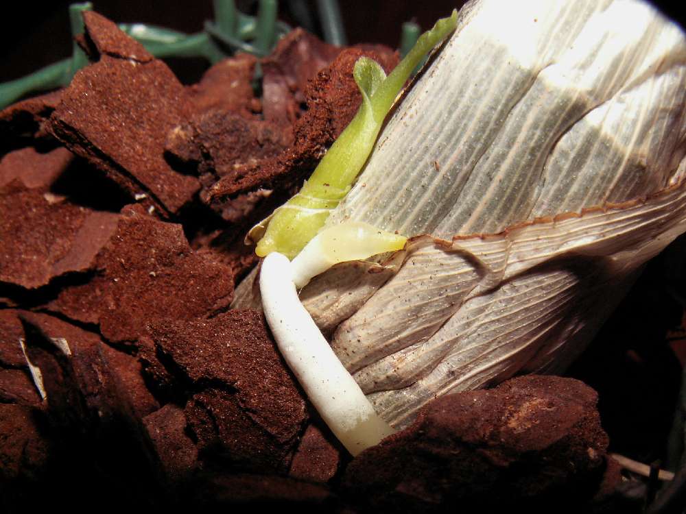 Takže kytka nasadila mohutný růst, zatím kořenů, ale i pahlíza se formuje. Tomu kořenu co neví, kde je dole, kapu vodu a snad se otočí. Zatím to vypadá, že se chce zavrtat do pahlízy.