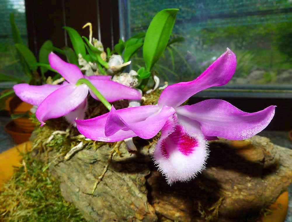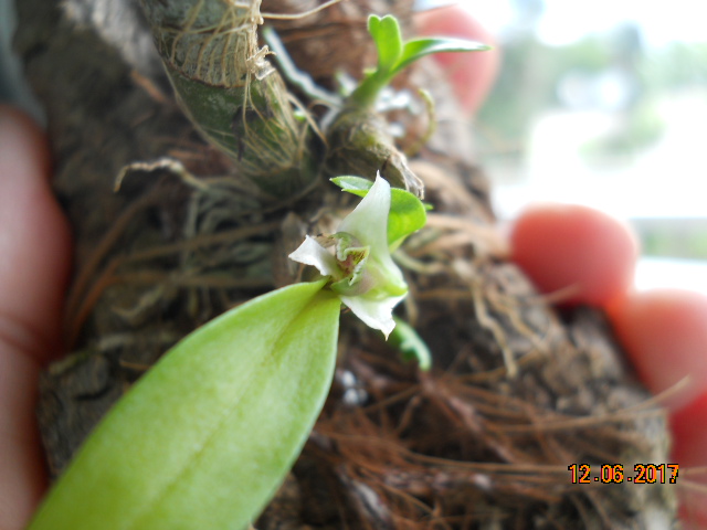 Právě mi rozkvetlo druhé Dendrobium parishii. Je menší a tak má pouze dva květy. Tvar i velikost květů je totožná jako u rostliny 1.